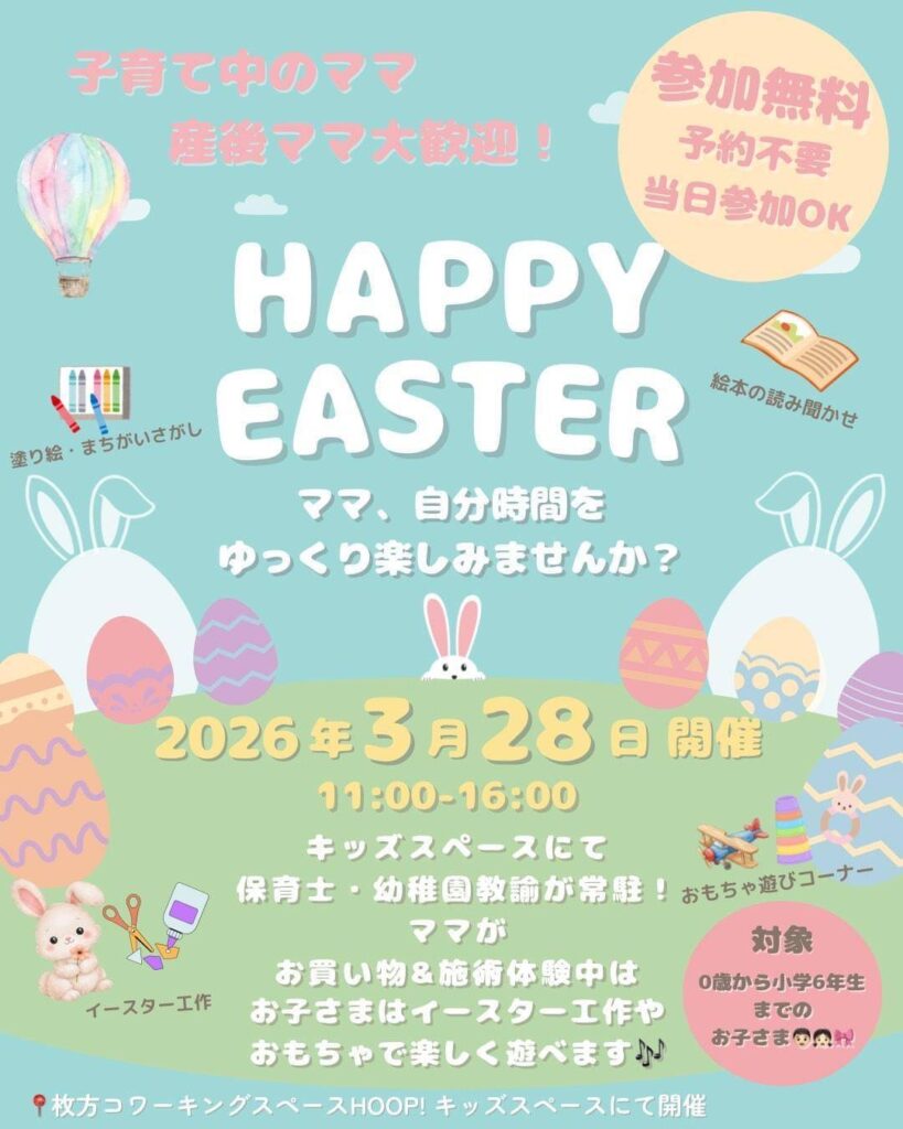 キッズスペースでは「HAPPY EASTER」と題して、イースター工作、塗り絵・まちがいさがし、絵本の読み聞かせ、おもちゃ遊びコーナーをご用意!(対象:0歳〜小学6年生) お子様が楽しく遊んでいる間、ママは安心してお買い物や施術を体験していただけます。